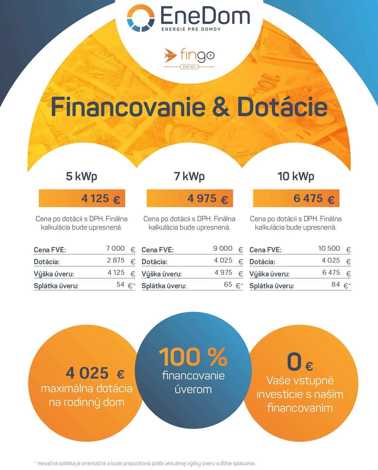 Na zvyšnú sumu potrebnú na inštaláciu solárnej elektrárne vám zabezpečíme výhodné financovanie, aby ste mohli začať šetriť energiami hneď a bez investovania vlastných peňazí. Spolupracujeme so skúsenými finančnými sprostredkovateľmi z FinGO.sk, ktorí vás spoľahlivo prevedú možnosťami financovania vašej novej solárnej elektrárne. Porovnajú vám vhodné úvery, financovanie vybavia rýchlo a jednoducho. Ušetríte tak čas aj peniaze. Pozrite si príklady financovania inštalácií, ktoré realizujeme najčastejšie.